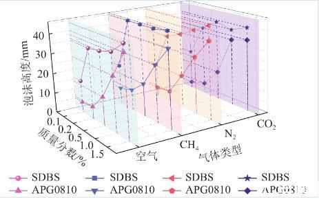對比同一種溶液通入不同氣體的高度進(jìn)行分析,空氣、氮氣及二氧化碳注入液體發(fā)泡性規(guī)律基本一致,均在質(zhì)量分?jǐn)?shù)最高時發(fā)泡率達(dá)到最大。通入甲烷時則在SDBS溶液質(zhì)量分?jǐn)?shù)為0.02%時就達(dá)到了與0.15%接近的發(fā)泡高度。APG0810在甲烷注入時也比其他氣體總體發(fā)泡率高,這是由于甲烷的摩爾質(zhì)量最低,氣體密度低,分子擴散快,泡沫膨脹速率變快導(dǎo)致的。