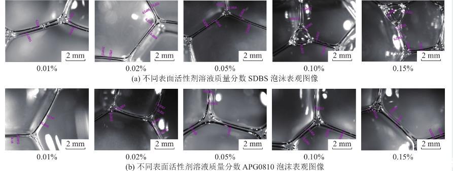 根據(jù)以上試驗結(jié)果可以獲得,溶液表面張力越小,則溶液發(fā)泡性能越好,溶液表面張力與發(fā)泡特性有較明顯相關(guān)性,而溶液黏度與泡沫性質(zhì)相關(guān)性不顯著。APG0810溶液黏度隨質(zhì)量分?jǐn)?shù)增加而增加,發(fā)泡性及泡沫穩(wěn)定性也逐漸增加,而SDBS溶液黏度先隨著溶液質(zhì)量分?jǐn)?shù)增加而降低,濃度較大時有上升趨勢,溶液發(fā)泡性及泡沫穩(wěn)定性呈現(xiàn)逐漸增加趨勢,且發(fā)泡性與泡沫穩(wěn)定性均優(yōu)于APG0810溶液。