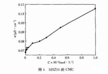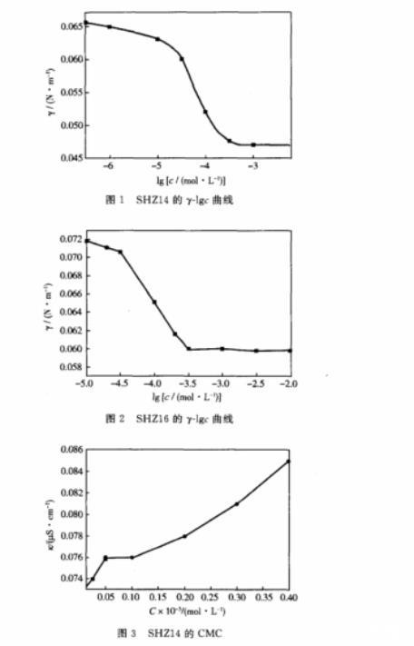 b.SHZ16的臨界膠束濃度為比SHZ14要低,這是由于SHZ16的碳?xì)滏湵萐HZ14稍長,導(dǎo)致疏水基之間的相互干擾減少,造成在表面的自組織能力增強,表面吸附能力有所升高,從而使臨界膠束濃度降低。