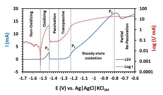 圖1電化學(xué)線性掃描伏安圖(LSV,藍(lán)色實(shí)線)及液滴電流的對(duì)數(shù)圖(紅色虛線),針對(duì)1 M NaOH中的鎵銦合金,掃描速率為0.5 mV/s。垂直虛線將圖中標(biāo)記的六個(gè)反應(yīng)區(qū)域區(qū)分開來(lái),標(biāo)記出三個(gè)氧化峰P1、P2和P3。