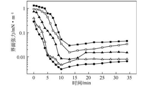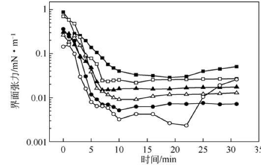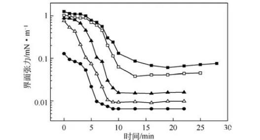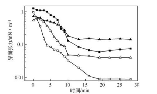 圖7不同助劑對復配體系油/水動態(tài)界面張力的影響