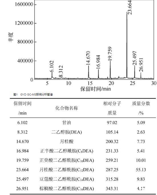 取一定量的GYD,用甲醇作溶劑,將其稀釋至約0.4%的質(zhì)量分數(shù)后,進行GC-MS全掃描分析,得總離子流色譜圖見圖1。用氣相色譜數(shù)據(jù)處理系統(tǒng),以峰面積歸一法測得其中各組分的相對質(zhì)量分數(shù),分析結果見表2。從表2可以看出,GYD是一種組成復雜的烷基醇酰胺混合物,主要包括不同碳數(shù)脂肪酸二乙醇酰胺和剩余原料甘油、二乙醇胺、月桂酸等。其中,月桂酸二乙醇酰胺相對含量最高為55.13%。