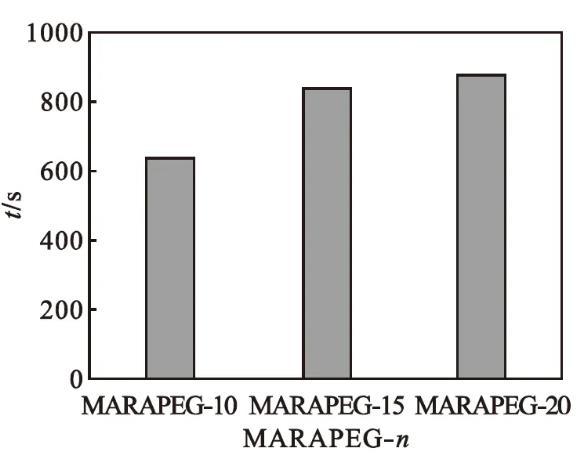 馬來酰蓖麻油酸聚乙二醇(n=10、15、20)酯的潤濕性能如圖5所示。由圖5可知:產(chǎn)品的潤濕時間隨著聚乙二醇聚合度的增大而增長。氧乙基數(shù)增加,其親水性增強(qiáng),降低表面張力的能力減弱,潤濕性能減弱。