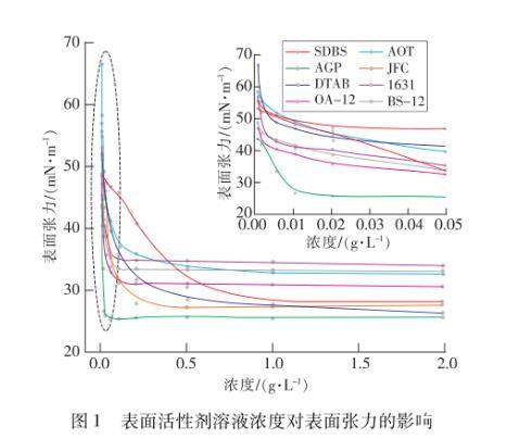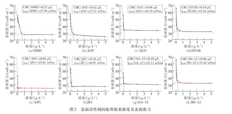 由圖2可見,8種表面活性劑溶液表面張力隨濃度變化的趨勢大體上相同,但其臨界膠束濃度及表面張力有較大差別。溶液臨界膠束濃度越小,說明表面活性劑分子在溶液中形成膠束的能力越強(qiáng)。8種表面活性劑的臨界膠束濃度主要集中在濃度為0.1~0.4 g/L左右,其中APG的臨界膠束濃度最小為0.04 g/L,SDBS的最大為0.53 g/L,8種表面活性劑形成膠束能力由強(qiáng)到弱排序?yàn)椋篈PG>BS-12>1631>OA-12>JFC>DTAB>AOT>SDBS,總體呈現(xiàn)出兩性型>非離子型>陽離子型>陰離子型的規(guī)律。溶液的γcmc值越小,表面活性劑降低表面張力的能力越強(qiáng),陰離子和非離子型的4種表面活性劑γcmc值均較低,其中APG降低表面張力能力最強(qiáng),γcmc值僅為25.61 mN/m,比水降低了65.15%。而陽離子和兩性型的表面張力較高,均在31.00 mN/m以上,1631降低表面張力的能力最弱,表面張力為34.79 mN/m。8種表面活性劑降低表面張力的能力由強(qiáng)到弱依次排序如下:APG>JFC>AOT>SDBS>OA-12>CTAB>BS-12>1631,總體而言,非離子型>陰離子型>兩性型>陽離子型。APG的臨界膠束濃度和表面張力都最低,這可能是因?yàn)锳PG分子為環(huán)狀結(jié)構(gòu),環(huán)狀結(jié)構(gòu)的碳原子上連接有醇羥基,這些醇羥基與水分子之間存在強(qiáng)相互作用,且在水溶液中溶解度很高,因此有效降低了溶液的表面張力,也更易形成膠束。
