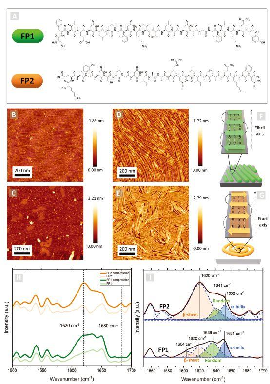 圖2、A)FP1和FP2肽的化學(xué)結(jié)構(gòu)。FP1(B和D)和FP2(C和E)肽LB膜的AFM顯微照片分別在無壓縮(B和C)和20 mN m-1(D和E)的情況下轉(zhuǎn)移到新鮮切割的云母基底上。F,G)導(dǎo)致纖維形成的肽β-折疊二級結(jié)構(gòu)的示意圖。H)在這項工作中研究的樣品的LDIR光譜。I)將酰胺I帶解卷積為其主要成分。