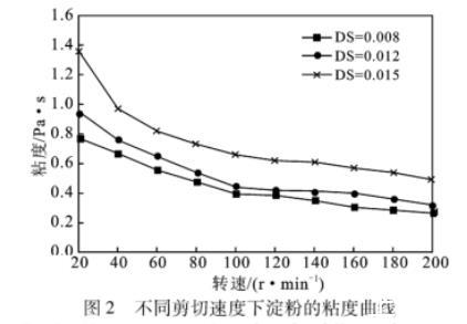 粘度是反映液體流變性能最常用的指標(biāo),粘度越小其流變性越高。由圖2可知,在同一轉(zhuǎn)速下,隨著取代度的增加,棕櫚酸酯淀粉糊液粘度升高;隨轉(zhuǎn)速增大,粘度先急劇下降后逐漸趨向平緩。棕櫚酸酯淀粉糊液粘度隨剪切速率的增大而減小,呈現(xiàn)“剪切稀化”特性,屬假塑性流體。淀粉糊液“剪切稀化”的程度與分子鏈的長短有關(guān),高DS淀粉酯相對分子質(zhì)量較高,“剪切稀化”程度也較大。淀粉糊液表觀粘度隨著剪切速率的增大而降低,表明淀粉凝膠網(wǎng)絡(luò)體系中分子間或分子內(nèi)的作用力(氫鍵)在較高的剪切速率下更容易被破壞。當(dāng)剪切速率繼續(xù)增加到淀粉分子纏結(jié)點(diǎn)、范德華力作用點(diǎn)被破壞完全來不及重建時(shí),淀粉糊液表觀粘度趨于最小值。