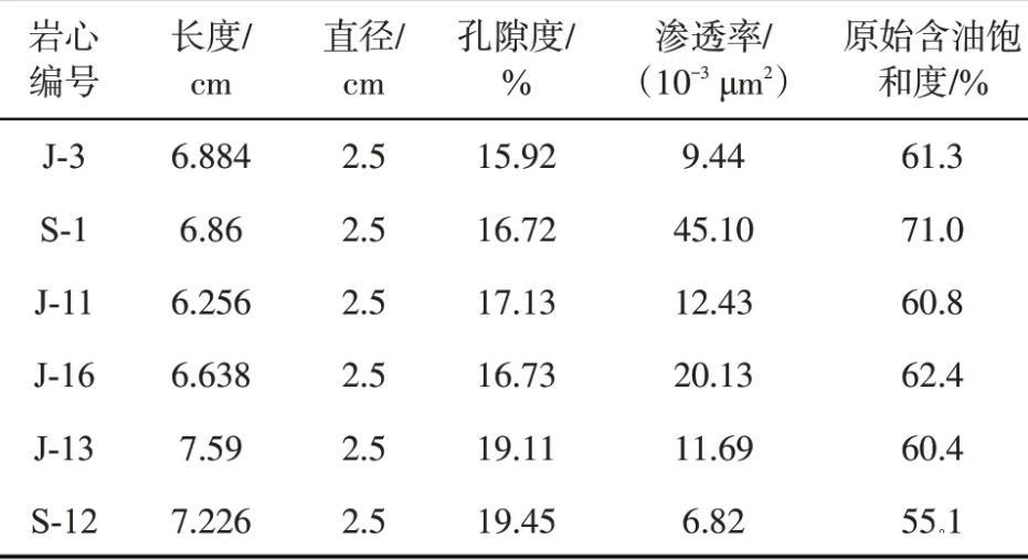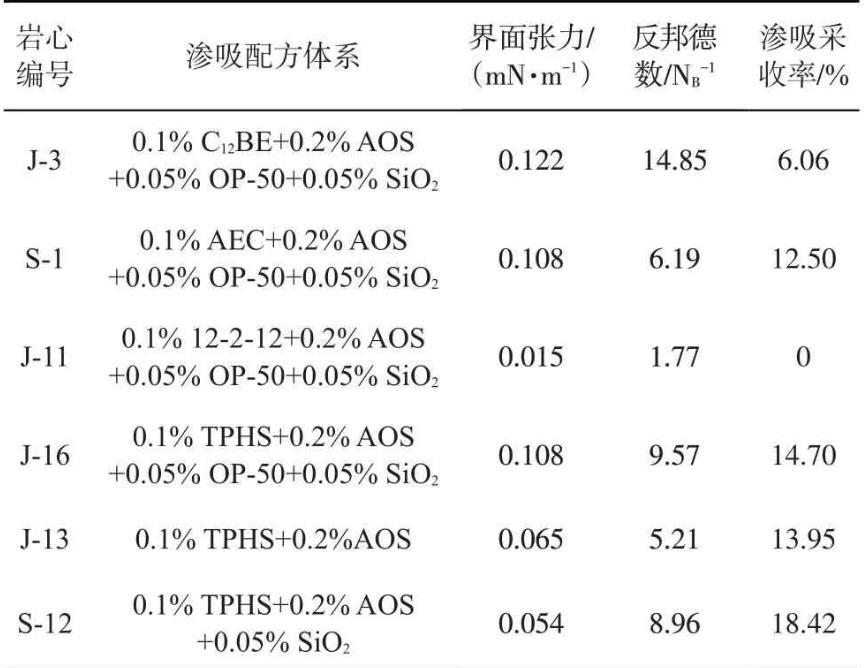 為驗(yàn)證TPHS活性納米流體在滲吸采收率的應(yīng)用,采用靜態(tài)滲吸實(shí)驗(yàn)開展TPHS及常見表面活性劑復(fù)配溶液滲吸效果對(duì)比研究,巖心的基本物性參數(shù)見表2,不同體系與原油間的界面張力、所計(jì)算的反邦德數(shù)和滲吸采收率結(jié)果見表3,結(jié)果表明在滲吸過程中毛管力起主導(dǎo)作用。