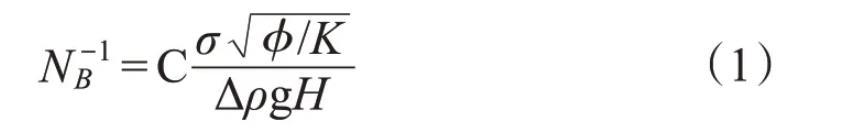 NB-1為滲吸機(jī)理判別參數(shù),式中沒有考慮巖石潤(rùn)濕性。NB-1>5時(shí),毛管力在滲吸作用中起主導(dǎo)作用;1<NB-1<5時(shí),重力和毛管力同時(shí)起作用;NB-1<<1時(shí),重力起主導(dǎo)作用。