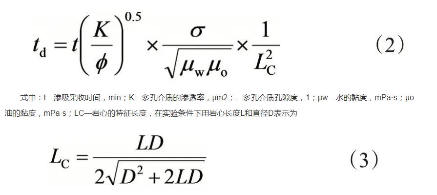 式中:t—滲吸采收時(shí)間,min;K—多孔介質(zhì)的滲透率,μm2;—多孔介質(zhì)孔隙度,1;μw—水的黏度,mPa·s;μo—油的黏度,mPa·s;LC—巖心的特征長(zhǎng)度,在實(shí)驗(yàn)條件下用巖心長(zhǎng)度L和直徑D表示為
