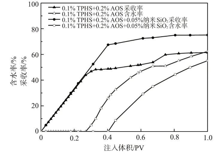少量納米SiO2顆粒與TPHS、AOS復(fù)配即可產(chǎn)生潤(rùn)濕協(xié)同作用,提高滲吸速率和采收率,并能形成乳液穩(wěn)定油墻,延長(zhǎng)無水采油期。