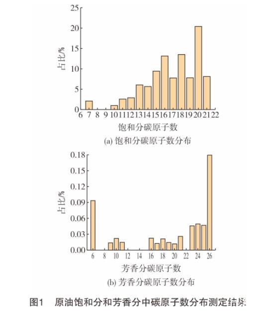 疏水端擴散進入原油的能力對表面活性劑在油水界面吸附,降低油水界面張力有直接影響。根據(jù)“相似相溶”原理,表面活性劑疏水端擴散進入原油的能力和其是否與原油中低極性組分(即飽和分和芳香分)具有相似結(jié)構(gòu)密切相關(guān)。因此,測定原油中飽和分和芳香分的碳原子數(shù)分布,對快速篩選驅(qū)油用表面活性劑具有指導(dǎo)意義。