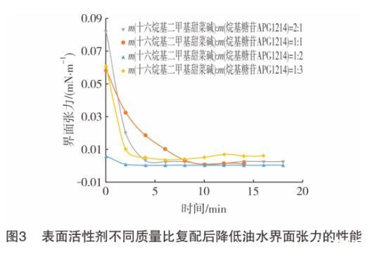 由于十六烷基二甲基甜菜堿和烷基糖苷APG1214降低油水界面張力效果最好,加之烷基糖苷APG1214本身疏水端碳原子數(shù)分布較寬(C12~C14),因此,考慮將二者進行復(fù)配,充分利用二者疏水端的空間位置互補效應(yīng),實現(xiàn)油水界面張力的進一步降低。