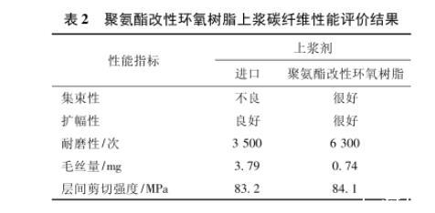 采用聚氨酯改性環(huán)氧樹脂上漿劑制備的碳纖維性能見表2。