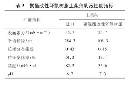 所制備的聚酯改性環(huán)氧樹脂上漿劑在核磁共振譜圖的1.6×10-6、3.8×10-6、4.8×10-6、6.8×10-6、7.2×10-6處,紅外光譜在3 309 cm-1、2 971/2 870cm-1、1 600 cm-1、1 721 cm-1以及1 103 cm-1等處出現(xiàn)甲基、苯環(huán)、聚酯、聚醚的特征吸收峰,表明結構中存在聚酯多元醇、雙酚A聚醚陰離子表面活性劑等組分。雙酚A聚醚陰離子表面活性劑具有優(yōu)異的乳化性能和極低的浸潤性能,在和聚酯多元醇配合的情況下,可顯著降低上漿劑乳液的表面張力,提高上漿效率,增強上漿均勻性和穩(wěn)定性。