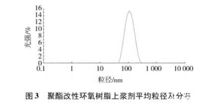 制備的聚酯改性環(huán)氧樹脂上漿劑乳液性能見表3,粒徑及分布測試結果見圖3。