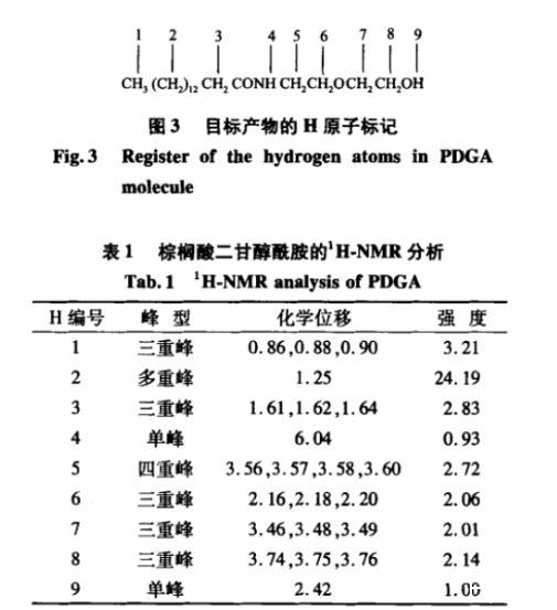 1)以四氫呋喃作溶劑,在氧化鎂存在下,通過棕櫚酸酰氯和二甘醇胺在0~5℃下反應(yīng)可以合成棕櫚酸二甘醇酰胺。在優(yōu)化反應(yīng)條件下產(chǎn)率可達到95%。經(jīng)紅外、質(zhì)譜、核磁等表征,合成產(chǎn)物與目標(biāo)產(chǎn)物的分子結(jié)構(gòu)相符,為一種單一化合物。