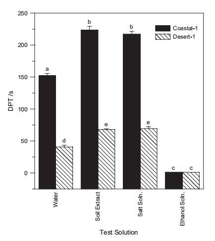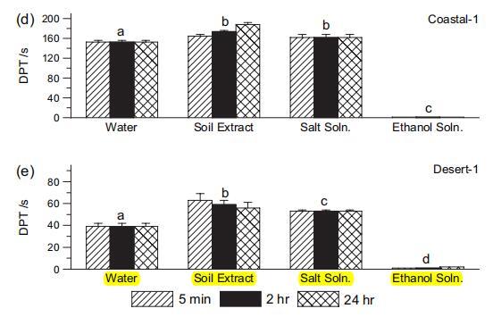 圖 4 水滴滲透時(shí)間 (DPT),2:1 w : w 2 小時(shí) 用于 Desert-1 和 沿海 1 土壤。 誤差棒顯示重復(fù)的標(biāo)準(zhǔn)偏差 滴。 小寫(xiě)字母給出了兩側(cè) t 檢驗(yàn)的結(jié)果。 不同字母表示均值在 P ? 0.01 顯著性水平。