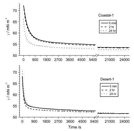 1:1 提取物的動(dòng)態(tài)表面張力測(cè)量 表明達(dá)到平衡的時(shí)間 γLV 從大約 15 分鐘到長(zhǎng)達(dá) 5 小時(shí)不等(圖 1)。 在所有情況下,都有一個(gè)相對(duì)較快的初始速度 γLV 的變化,這可能是擴(kuò)散受限的,和 然后是一段長(zhǎng)時(shí)間的低利率 γLV 的變化。 平衡達(dá)到率低的時(shí)期被假定為至少兩個(gè)過(guò)程的結(jié)果:(i)不同分子之間的表面競(jìng)爭(zhēng) 吸附位點(diǎn); (ii) 表面分子的重排。 時(shí)間之間沒(méi)有明顯的關(guān)系 實(shí)現(xiàn)不同的平衡 γLV 和提取時(shí)間 土壤(圖 1)。