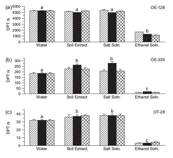 圖 3 液滴穿透時(shí)間 (DPT) 水、1:1 土壤提取物、鹽溶液和不同土壤的乙醇溶液:(a) OE-128; (b) OE-335; (c) OT-28; (d) Coastal-1; (e) 沙漠-1。 誤差線顯示標(biāo)準(zhǔn)偏差 復(fù)制滴。 小寫(xiě)字母給出 兩側(cè) t 檢驗(yàn)的結(jié)果。 在給定的 窗格中,不同的字母表示均值 在 P ? 0.01 顯著差異 癌癥水平。 對(duì)于 t 檢驗(yàn),結(jié)果為 三個(gè)提取時(shí)間(5 分鐘、2 小時(shí)和 24 小時(shí))一起考慮,因?yàn)樗鼈兊?γLV 值非常相似(圖 2b)。