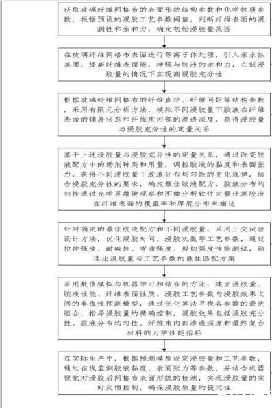 獲取玻璃纖維網(wǎng)格布的表面形貌結構參數(shù)和化學性質參數(shù),根據(jù)預設的浸膠工藝參數(shù)閾值,判斷纖維表面的浸潤性和親和力,確定初始浸膠量范圍;在玻璃纖維網(wǎng)格布表面進行等離子體處理,引入親水性基團,提高纖維表面能,增強與膠液的親和力,在低浸膠量的情況下實現(xiàn)高浸膠充分性;根據(jù)玻璃纖維網(wǎng)格布的纖維直徑、纖維間距等結構參數(shù),采用有限元分析方法,模擬不同浸膠量下膠液在纖維表面的鋪展狀態(tài)和纖維束內部的滲透深度,獲得浸膠量與浸膠充分性的定量關系;基于上述浸膠量與浸膠充分性的定量關系,通過改變膠液配方中的助劑種類和用量,調控膠液的黏度和表面張力,獲得不同浸膠量下膠液分布均勻性的變化規(guī)律,結合浸膠充分性的要求,確定最佳膠液配方,膠液分布均勻性通過光學顯微鏡觀察和圖像分析軟件定量計算膠液在纖維表面的覆蓋率和厚度分布來描述;針對確定的最佳膠液配方和不同浸膠量,采用正交試驗設計方法,優(yōu)化浸膠時間、浸膠次數(shù)等工藝參數(shù),通過拉伸強度、耐堿性、彎曲強度、剪切強度性能測試,篩選出浸膠量與工藝參數(shù)的最佳匹配方案;采用數(shù)值模擬與機器學習相結合的方法,建立浸膠量、膠液性能、纖維表面性質、浸膠工藝參數(shù)與浸膠效果之間的非線性預測模型,通過優(yōu)化算法尋找各參數(shù)的最優(yōu)組合,指導浸膠量的精確控制,浸膠效果包括浸膠充分性、膠液分布均勻性、纖維束內部滲透深度和最終復合材料的力學性能指標;在實際生產(chǎn)中,根據(jù)預測模型設定浸膠量和工藝參數(shù),通過在線監(jiān)測膠液黏度、表面張力等參數(shù),并結合機器視覺對浸膠后網(wǎng)格布表面形貌的檢測,實現(xiàn)浸膠量的實時反饋控制,確保浸膠質量的穩(wěn)定性。