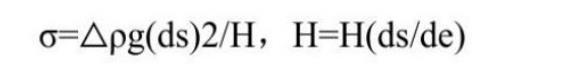 在(25±0.1)℃下使用光學(xué)測量儀,使用注射器注射液體呈現(xiàn)出最大直徑de的液滴時(shí),通過L-Y方程計(jì)算液體的表面張力σ的大小。對于每個(gè)溶液的表面張力值計(jì)算四次測量的平均值,以減小實(shí)驗(yàn)誤差,表面張力(mN/m)的計(jì)算如下面所示: