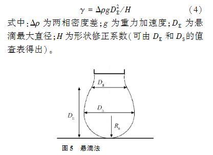 Jyoti等使用軸對稱液滴形狀分析法(axisymmetricdropshapeanalysis,ADSA)研究單層壓縮速率對表面張力?表面積等溫線形狀的影響。懸滴法(見圖5)可認(rèn)為是ADSA的雛形,其通過Laplace方程應(yīng)用于液滴輪廓來確定懸垂液滴的表面張力和接觸角,懸滴法實(shí)質(zhì)上是滴外形法的一種。滴外形法的基本原理是:當(dāng)液滴在管口形成時(shí),液滴形狀與表面張力存在一定的關(guān)系。懸滴法測量表面張力可由下列公式計(jì)算:γ=ΔρgD2E/H(4)式中:Δρ為兩相密度差;g為重力加速度;DE為懸滴最大直徑;H為形狀修正系數(shù)(可由DE和DS的值查表得出)。