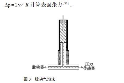 脈動(dòng)氣泡法測量裝置如圖3所示。待測試液置于小體積的樣品室中,樣品室通過垂直毛細(xì)管與環(huán)境空氣連通。脈動(dòng)器活塞的運(yùn)動(dòng)在腔室中產(chǎn)生負(fù)壓,導(dǎo)致空氣被吸入毛細(xì)管形成氣泡。當(dāng)活塞來回移動(dòng)時(shí),氣泡會(huì)產(chǎn)生脈動(dòng),從而模擬呼吸動(dòng)力學(xué)。通過脈動(dòng)器的預(yù)設(shè)程序改變氣泡半徑R,并且由壓力傳感器記錄氣泡周圍的壓力,根據(jù)拉普拉斯定律Δp=2γ/R計(jì)算表面張力。