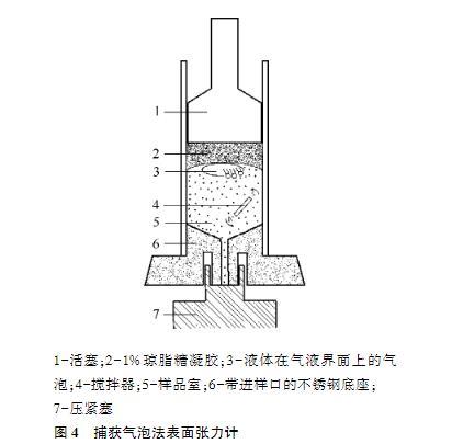 為了避免膜泄漏的出現(xiàn),Schürch等引入了一種防泄漏的捕獲氣泡法表面張力計(jì)。在捕獲氣泡法裝置中(見圖4),待測液體充滿樣品室,樣品室頂部鍍有一親水性瓊脂糖凝膠,從底部進(jìn)樣口引入的氣泡在浮力作用下上升并緊靠瓊脂糖凝膠層,同時(shí)氣泡和凝膠層之間由于液體樣品薄層的阻隔,故不會(huì)黏附于凝膠層之上。氣泡的體積通過改變樣品室中的壓力來控制。隨著氣泡體積減小,表面積減小,氣泡表面張力下降。氣泡形狀隨表面張力的變化而變化,從球形到橢圓形。對于初始直徑大于5mm氣泡,當(dāng)表面張力趨于0時(shí),氣泡呈薄圓盤狀。測量時(shí),通過推動(dòng)活塞改變樣品室的壓力來控制氣泡體積,并用視頻記錄氣泡體積變化。最后從視頻圖像中測得氣泡的高度和直徑,利用Malcolm等提出的方法計(jì)算氣液界面的表面張力、氣泡體積和表面積。