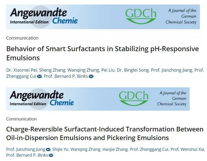 近期,江南大學(xué)蔣建中-崔正剛科研團(tuán)隊在新型智能表面活性劑設(shè)計開發(fā)領(lǐng)域取得突破性研究進(jìn)展,連續(xù)在Angew.Chem.Int.Ed.上發(fā)表2篇研究論文:“Behavior of smart surfactants in stabilizing pH-responsive emulsions,Angew.Chem.Int.Ed.2021,60,5235-5239(通訊作者崔正剛教授和B.P.Binks教授)”和“Charge-reversible surfactant-induced transformation between oil-in-dispersion emulsions and Pickering emulsions,Angew.Chem.Int.Ed.2021,60,11793-11798(通訊作者蔣建中教授和B.P.Binks教授)”。