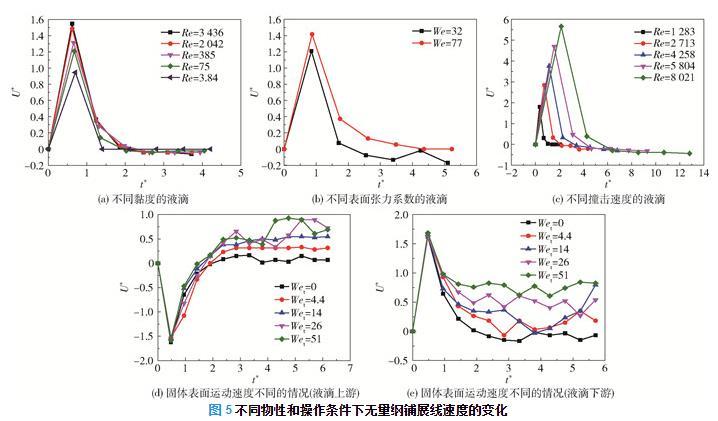 在固體表面水平運動時,定義液滴上游方向為液滴鋪展與固體表面運動相同的方向,反之為液滴下游方向。如圖5(d)所示,液滴上游鋪展線速度(絕對值)在撞擊后的短時間內(nèi)增加到最大值,但由于其方向與固體表面運動方向相反,隨著固體表面運動速度的增大,液滴受到的黏性力增大,且上游鋪展線速度降低。液滴上游鋪展線速度降至0之后,黏性力與上游鋪展線速度的方向開始相同,此時黏性力作正功,因此固體表面運動速度的增大會使得上游鋪展線速度增大,直至上游鋪展線速度與表面運動速度相等。如圖5(e)所示,在撞擊的瞬間,液滴下游鋪展線速度大于表面的運動速度,此時黏性力做負功,且下游鋪展線速度會逐漸減小至固體表面運動速度。