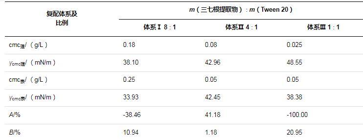 由表2可知,三七根提取物與Tween 20按不同質(zhì)量比復(fù)配后,均表現(xiàn)出一定程度的降低溶液表面張力能力增效。復(fù)配體系降低溶液表面張力的能力增效比較:體系Ⅲ>體系Ⅰ>體系Ⅱ;復(fù)配體系形成膠束的能力增效比較:體系Ⅱ>體系Ⅰ>體系Ⅲ。其中,體系Ⅱ形成膠束的能力增效41.18%,表明其形成膠束的能力較強。體系Ⅱ降低溶液表面張力的能力可以增效1.18%。在理論最佳復(fù)配質(zhì)量比下,復(fù)配體系cmc為0.05 g/L,γcmc為42.45 mN/m,復(fù)配增效作用比較明顯,因此選擇m(三七根提取物)∶m(Tween 20)=4∶1進行復(fù)配。