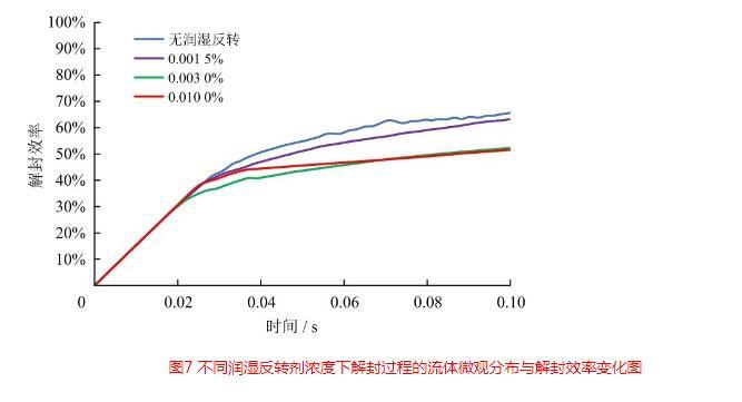 圖7不同潤(rùn)濕反轉(zhuǎn)劑濃度下解封過(guò)程的流體微觀分布與解封效率變化圖