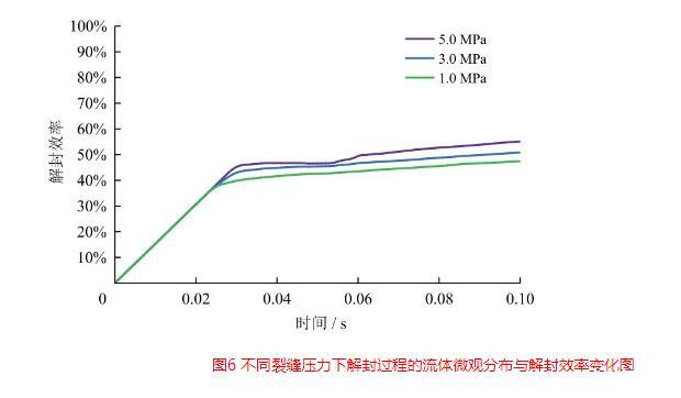 圖6不同裂縫壓力下解封過(guò)程的流體微觀分布與解封效率變化圖