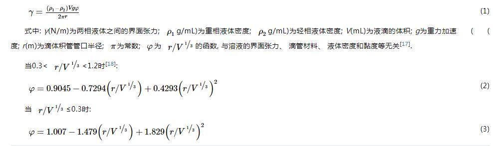式中:γ(N/m)為兩相液體之間的界面張力;ρ1(g/mL)為重相液體密度;ρ2(g/mL)為輕相液體密度;V(mL)為液滴的體積;g為重力加速度;r(m)為滴體積管管口半徑;π為常數(shù);φ為r/V1/3的函數(shù),與溶液的界面張力、滴管材料、液體密度和黏度等無關。