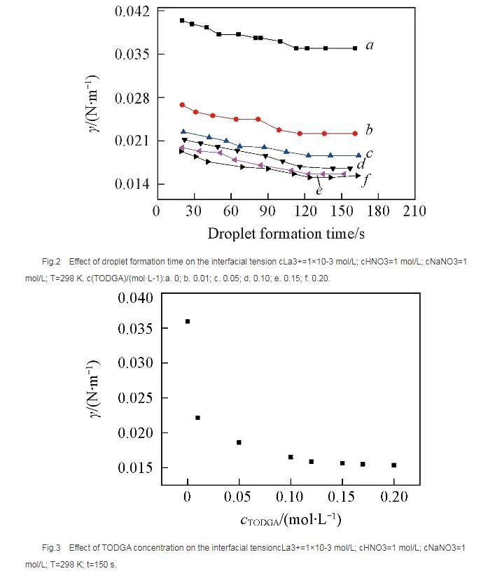 考察了以正辛烷作稀釋劑時,不同TODGA濃度體系的界面張力隨液滴形成時間的變化情況。從圖2可以看出,對于不同TODGA濃度(包括不添加TODGA)的體系,界面張力均隨著時間的延長逐漸降低,約在120 s時基本達到界面吸附平衡,可以認為萃取過程在此時間段內(nèi)基本完成;液滴形成時間相同時, TODGA濃度越大,體系的界面張力值越小,即不同濃度下達到界面吸附平衡的濃度不同,表明不同TODGA濃度體系界面物種成分不同。