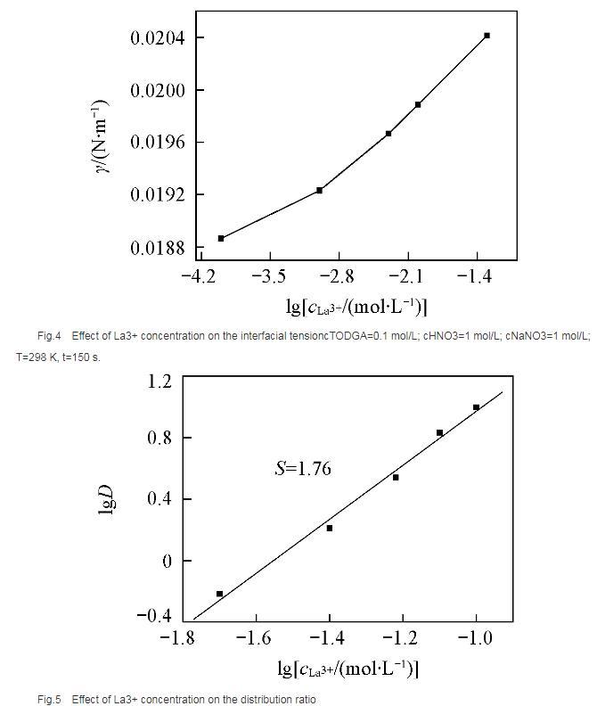 在相同水相條件下,測(cè)定了萃取劑濃度對(duì)分配比的影響(圖5),根據(jù)斜率法得到萃合物的組成為L(zhǎng)a(NO3)3·2TODGA.位于界面區(qū)域的萃取劑與金屬離子形成萃合物,界面區(qū)域游離萃取劑分子減少,導(dǎo)致體系的界面張力增大。