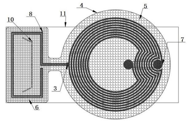作為本發(fā)明的一種優(yōu)選技術(shù)方案:若射頻芯片為具有偵測功能的射頻芯片,則由射頻芯片的射頻端口連接布設(shè)于承載基材表面的第一走線,由第一走線在承載基材其中一端的表面上構(gòu)成射頻輻射結(jié)構(gòu),并且由射頻芯片的偵測端口連接布設(shè)于承載基材表面的第二走線,由第二走線在承載基材另一端的表面上構(gòu)成偵測結(jié)構(gòu);