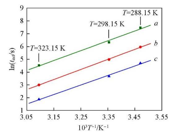 Liu和Nancollas[32]提出了一個反映成核誘導(dǎo)期(tind)與溫度關(guān)系的經(jīng)驗方程式: