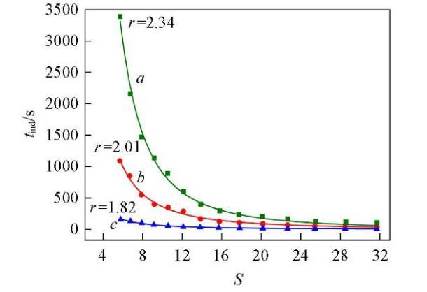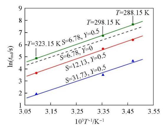 分別在288.15,298.15和323.15 K時研究了NaCl的添加對Li2CO3成核誘導(dǎo)期的影響,每組實驗均在Cl?的超額含量(Y=0.5)的條件下進行,結(jié)果見圖4.可知,在同一溫度下,Li2CO3的成核誘導(dǎo)期仍然隨過飽和度的增大而縮短;在同一過飽和度下,Li2CO3的成核誘導(dǎo)期隨溫度的升高而縮短,而且在添加NaCl(Y=0.5)后,溫度對Li2CO3成核誘導(dǎo)期的影響比未添加(Y=0)時更為顯著.如,在過飽和度S=5.76,溫度從288.15 K升高到323.15 K時,添加NaCl后Li2CO3的成核誘導(dǎo)期縮短了73.01%,而未添加NaCl時Li2CO3的成核誘導(dǎo)期縮短了67.89%.