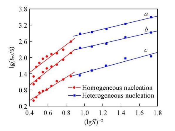 誘導(dǎo)期與初始過飽和度之間存在著很強的依賴關(guān)系.當(dāng)初始過飽和度足夠高時,成核可認為是均相的;當(dāng)初始過飽和度足夠低時,成核則以非均相為主[37].在恒定溫度下,由晶體成核過程中的lgtind對(lgS)?2作圖可得兩條斜率不同的直線,分別對應(yīng)著兩種不同的成核機制,即初級均相成核和初級非均相成核[37].由不同溫度時Li2CO3的lgtind對(lgS)?2作圖,結(jié)果如圖3所示.可知,成核機制的變化引起了直線斜率的改變,均相成核對應(yīng)的直線斜率明顯大于非均相成核時的直線斜率(Bhom>Bhet).在較低的過飽和度時,成核以非均相成核為主;而過飽和度增大到12.13以后,成核則以均相成核為主.