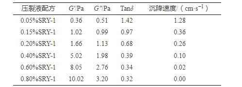 測試表明:隨SRY-1濃度的增加,壓裂液彈性模量G′不斷增大,Tanδ不斷減小,并且SRY-1超過CAC1(0.18%)后,增大和減小的趨勢更明顯。從壓裂液微觀作用機(jī)理分析,優(yōu)良的黏彈特性建立在CAC之上,依靠分子鏈間多重共價鍵交聯(lián)作用來形成高強(qiáng)度空間網(wǎng)絡(luò)結(jié)構(gòu),才能在壓裂液懸浮、攜帶支撐劑能力上發(fā)揮獨(dú)特優(yōu)勢。為此,進(jìn)一步測試了40/70支撐劑在壓裂液中的沉降速度,結(jié)合壓裂液G′、G″、Tanδ與沉降速度進(jìn)行關(guān)聯(lián)分析,如表5所示。
