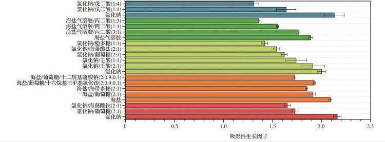 在實(shí)驗(yàn)室中通過吸濕串聯(lián)差分電遷移率分析儀測(cè)量給定RH下的粒徑與干粒徑的比值,以通過吸濕性生長因子來量化吸濕性。最近許多研究關(guān)注到表面活性物質(zhì)對(duì)顆粒吸濕性的影響。圖4總結(jié)了當(dāng)前一些研究中量化的表面活性物質(zhì)對(duì)SSA模擬物吸濕性的影響。