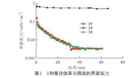 在比較3種復(fù)合體系驅(qū)油特征之前,應(yīng)確定其能否滿足超低界面張力和良好乳化性能的基本設(shè)計要求。因此,首先針對選用的復(fù)合體系,測試其與稠油的界面張力(圖1)。1#超低界面張力復(fù)合體系和3#雙效復(fù)合體系與稠油的界面張力均能達(dá)到超低水平,為3.0×10-3mN/m;而2#乳化復(fù)合體系與稠油的界面張力為5.1×10-1mN/m。3種復(fù)合體系與稠油的界面張力表現(xiàn)出顯著的不同,符合進(jìn)一步驅(qū)油對比的需要。此外,盡管超低界面張力有利于減小毛細(xì)管力和稠油在巖石壁面的黏附功,但是對于稠油復(fù)合驅(qū),乳化降黏機(jī)理極為關(guān)鍵,需進(jìn)一步對3種復(fù)合體系的乳化性能加以研究。