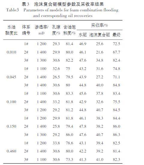 因此,在該水油黏度比下,乳化對稠油泡沫復(fù)合驅(qū)具有較明顯的貢獻(xiàn)。②當(dāng)水油黏度比大于等于該界限,分別為0.150和0.460時,1#,2#和3#泡沫復(fù)合體系驅(qū)油采收率增幅分別為38.3%,38.2%,40.7%和39.4%,39.2%,41.0%,3種泡沫復(fù)合體系驅(qū)油效果相差較小,乳化的貢獻(xiàn)較小,泡沫復(fù)合體系設(shè)計中不應(yīng)過分強(qiáng)調(diào)乳化性能。此外,對比復(fù)合驅(qū)(表2,圖5)和泡沫復(fù)合驅(qū)(表3,圖6)可見:①泡沫的引入確實(shí)能夠顯著提高稠油采收率,以水油黏度比0.010為例,1#,2#,3#復(fù)合體系驅(qū)油采收率增幅分別為15.9%,17.1%,20.6%,而泡沫復(fù)合體系分別為25.6%,21.6%,34.8%,顯著高于前者,相差幅度為9.7%,4.5%,14.2%,這說明泡沫復(fù)合驅(qū)在稠油驅(qū)替方面極具潛力。②與單一復(fù)合體系相比,泡沫復(fù)合體系驅(qū)替稠油對體系乳化性能的要求降低,能夠?qū)⑷榛阅芤蟮慕缦迯乃宛ざ缺葹?.200減小至0.150。