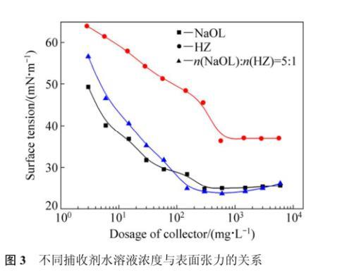 表面張力是影響浮選過程中氣泡的穩(wěn)定性,以及氣泡形成難易程度的主要參考數(shù)據(jù),臨界膠團(tuán)濃度(簡稱CMC)是反映表面活性劑降低水溶液表面張力的效率。組合用藥的浮選效果優(yōu)于單一用藥,這可能與其在水溶液中的表面張力有一定的關(guān)系。圖3所示為最佳pH條件下(pH=9.0)組合捕收劑與兩種單一捕收劑的水溶液濃度與表面張力的關(guān)系。NaOL在水中微量的添加顯著地降低了水的表面張力,而隨著NaOL濃度的增加,溶液的表面張力逐漸下降,在濃度為302 mg/L時溶液的表面張力達(dá)到最低,為22.7~24.8 mN/m。此后NaOL濃度的增加并不能顯著地降低水的表面張力,所以可以確定NaOL的CMC值約為302 mg/L,與文獻(xiàn)中報道的1.03×10?3mol/L(308 mg/L)接近。而HZ的CMC值568 mg/L,表面張力36.37 mN/L。作為一種表面活性劑,其表面活性明顯不如NaOL,在較高濃度下,HZ才能形成膠團(tuán)。浮選HZ用量為200 mg/L,低于其CMC值,在此濃度下,膠團(tuán)未形成,表面張力較高,起泡性不佳,在單礦物浮選試驗(yàn)中表現(xiàn)出了泡沫量小的特點(diǎn)。組合捕收劑水溶液的表面張力測試結(jié)果表明,CMC值約為150 mg/L,CMC值下水溶液表面張力為24.88 mN/m。可見HZ的添加能降低NaOL的CMC值,這可能是NaOL作為一種陰離子型表面活性劑,親水“離子頭”之間的靜電作用較強(qiáng),非離子表面活性劑的“插入”到親水“離子頭”之間,同時亞氨基也存在一定程度的解離,使得離子之間的靜電斥力減小。