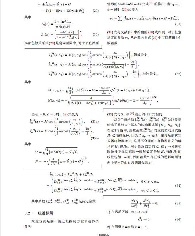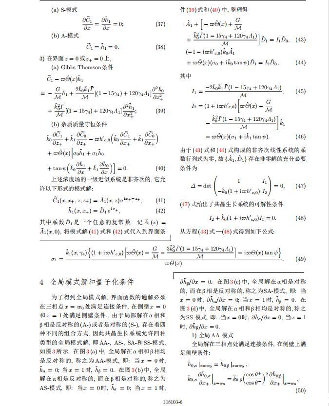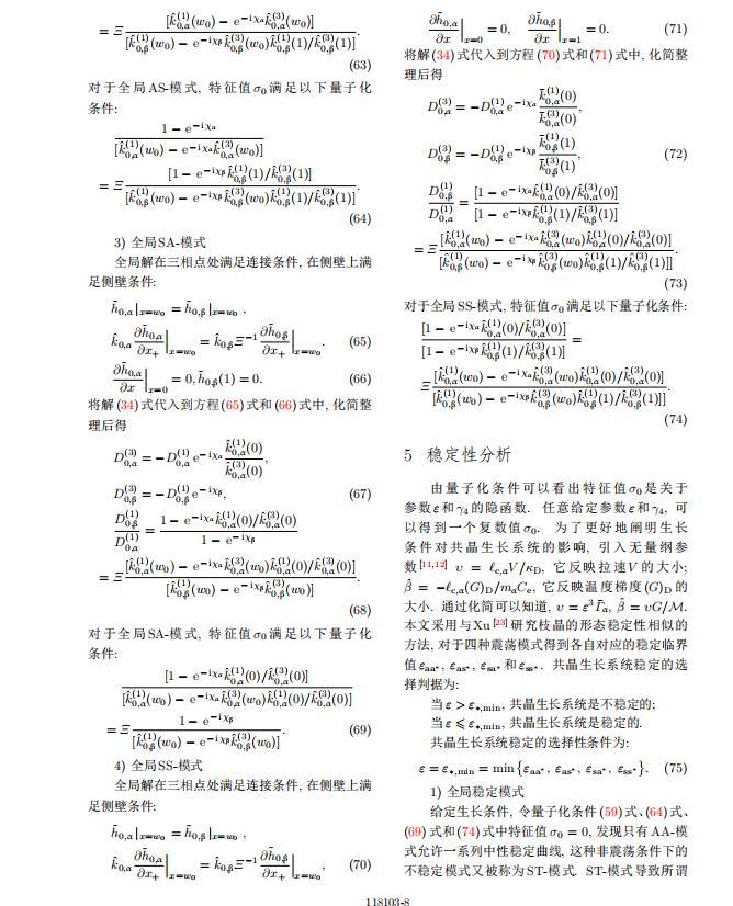 將系統(tǒng)方程以振幅遠小于1進行線性化處理,結(jié)合(1)式—(4)式,可以得到共晶生長系統(tǒng)的擾動態(tài)滿足以下控制方程和邊界條件: