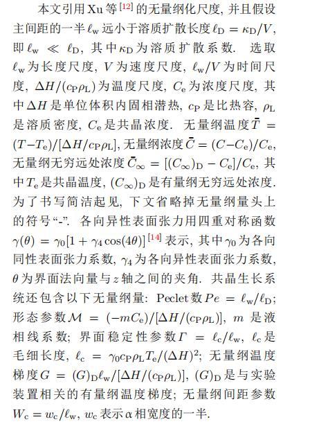 固體材料本身并非各向同性介質(zhì),其晶格結(jié)構(gòu)使固體體內(nèi)的物理量以及表面的物理參數(shù)依賴于取向,變?yōu)楦飨虍愋粤?固體材料這些物理參量的各向異性特征對凝固過程動力學與界面穩(wěn)定性機理以至對界面微結(jié)構(gòu)圖案的形成與選擇造成重要的影響[14].王志軍等[15,16]研究了各向異性表面張力對定向凝固過程中初始平界面穩(wěn)定性的影響,發(fā)現(xiàn)各向異性表面張力的非線性效應(yīng)導(dǎo)致界面傾斜生長.Chen等[17]研究了各向異性表面張力對定向凝固過程中球晶生長的影響,發(fā)現(xiàn)在各向異性表面張力作用下,球晶生長初始階段部分界面首先向內(nèi)移動,達到一定的熔化深度后向外移動.Xu[18]研究了各向異性表面張力對定向凝固過程中枝晶生長的影響,發(fā)現(xiàn)當存在各向異性表面張力時,枝晶系統(tǒng)具有兩種不同的整體不穩(wěn)定性機理:震蕩不穩(wěn)定性與低頻不穩(wěn)定性.陳明文等[19]研究了各向異性表面張力對定向凝固過程中深胞晶生長的影響,發(fā)現(xiàn)當各向異性表面張力增大時,深胞晶界面全長增大,根部低端的曲率半徑增大.本文應(yīng)用多重變量展開法研究各向異性表面張力條件下定向凝固共晶生長形態(tài)穩(wěn)定性,揭示了各向異性表面張力對共晶生長不穩(wěn)定性區(qū)域大小的影響.