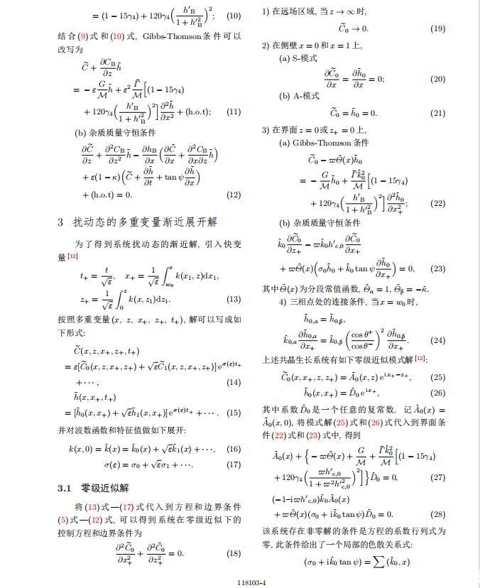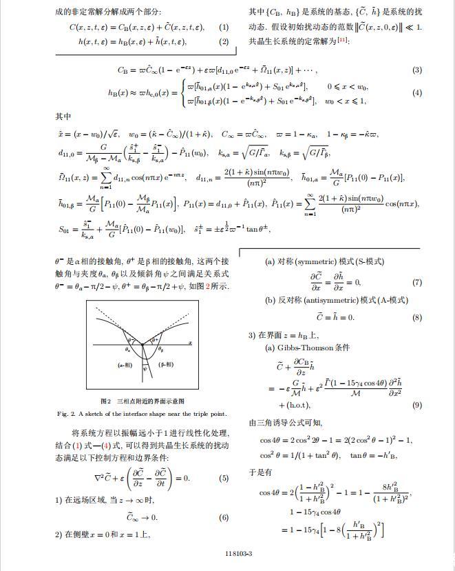 為考察共晶生長形態(tài)穩(wěn)定性,利用共晶生長的定常解作為基態(tài)進行穩(wěn)定性分析.在初始時刻t=0時對基態(tài)解做一小擾動,并將在t>0以后形成的非定常解分解成兩個部分: