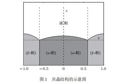 假設(shè)由α和β兩相組成的片層共晶以拉度V向液相穩(wěn)定推進,共晶片層與固-液界面垂直.選取固-液界面處α相片層的中心為坐標原點,x軸與片層垂直,z軸與晶體生長方向平行,如圖1所示.共晶界面用函數(shù)z=h(x,t)表示,它也是共晶生長解的一部分.