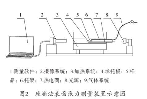 座滴法表面張力測量裝置結(jié)構(gòu)如圖2所示,由測量軟件、攝像系統(tǒng)、加熱系統(tǒng)、承托板、樣品、托架、熱電偶、光源、氣體系統(tǒng)構(gòu)成。
